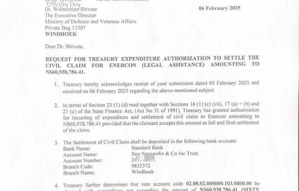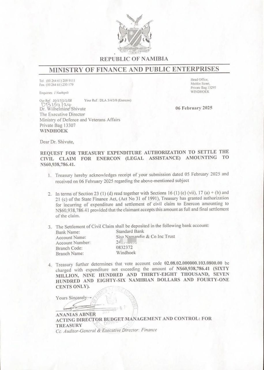 The letter states that Treasury received authorisation to settle a N$60.9 million civil claim with Enercon.