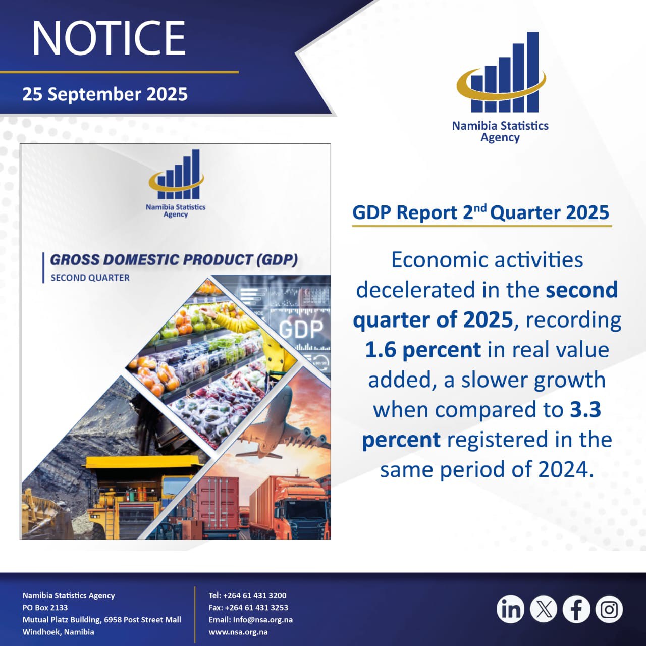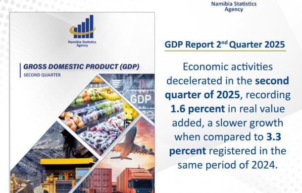 The Namibia Statistics Agency (NSA) announced on Thursday that the country’s economy grew by 1.6% in real terms during the second quarter of 2025 (Q2 2025). This represents a slowdown compared to the 3.3% increase recorded in the same period in 2024.