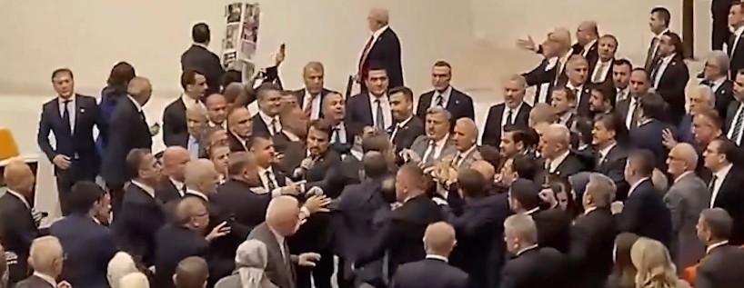 Debates over a new pension bill in Turkey's Grand National Assembly spiralled into chaos on Sunday, with lawmakers trading punches in a brawl that raged for nearly 10 minutes on the chamber floor.