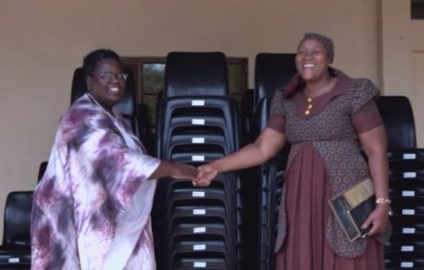 Handing over the donation of 200 chairs and 20 tables was Juliet Kavetuna, a board member of KenMatri company.