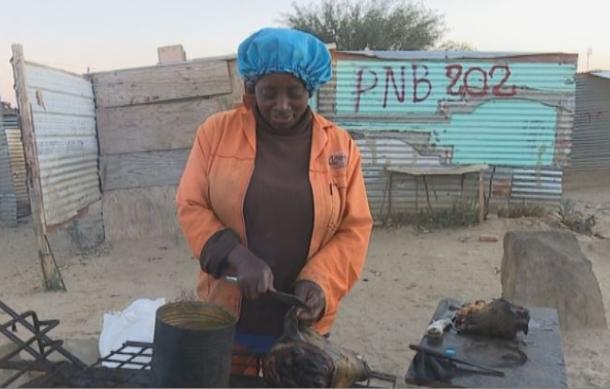 On the side of the road in Greenwell, 39-year-old Aina Iipinge sat around the fire with her children to keep warm while they waited for the food to cook.