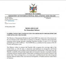 The Ministry of International Relations and Trade has acknowledged a new U.S. pilot programme requiring certain foreign nationals, including Namibians, to post a visa bond of about N$250,000 for tourist and business visas.