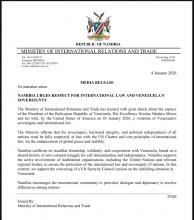 Namibia has urged respect for international law and Venezuela's sovereignty following the capture of that country's president, Nikolas Maduro, and his wife by the US.