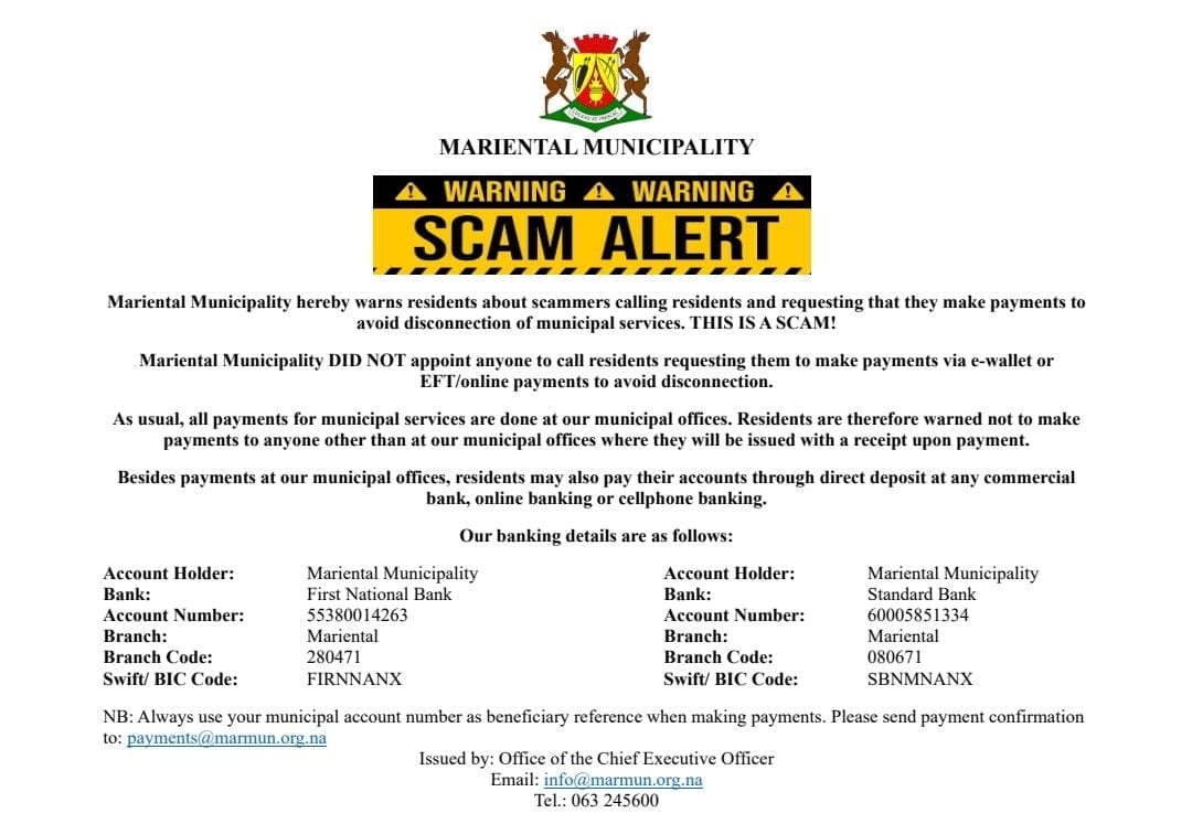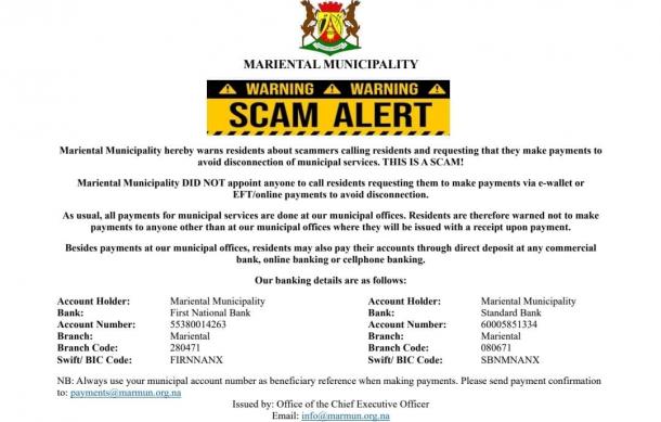 The Mariental Municipality has warned members of the public about scammers calling residents and requesting payments for their municipal services, such as water and electricity supply, not to be disconnected.