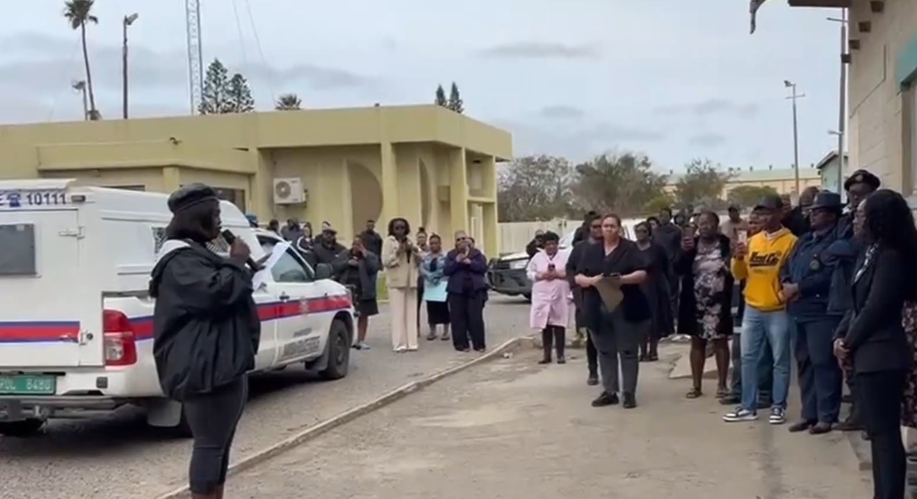 " Our kids, as you see them behind me, are so traumatised. The teachers cannot teach; it has affected the teaching and learning process, and it has affected the whole community. It also created a widespread fear among parents, teachers, children and the whole community. We don't feel safe in Oranjemund anymore. Our community is distressed by the possibility of them being granted bail today and walking free among us, which would jeopardise community safety and trust: "