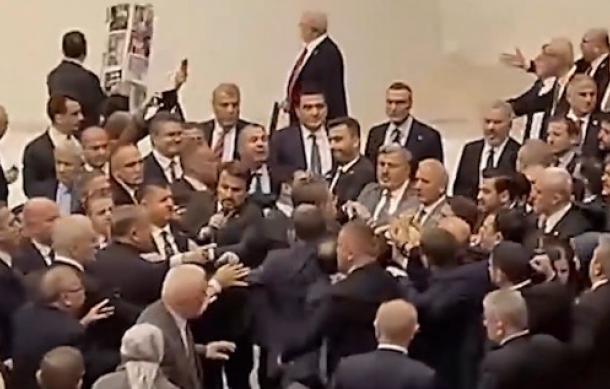 Debates over a new pension bill in Turkey's Grand National Assembly spiralled into chaos on Sunday, with lawmakers trading punches in a brawl that raged for nearly 10 minutes on the chamber floor.